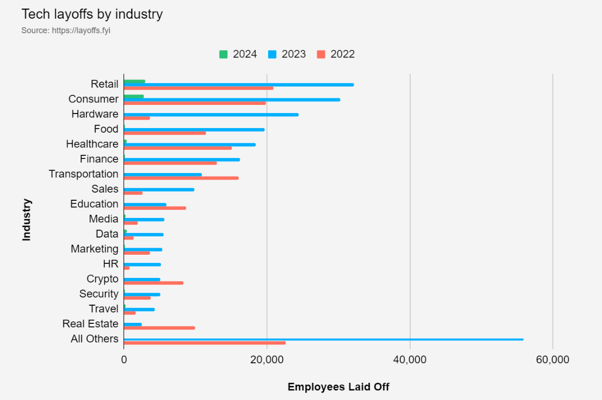 미국의 경우 2023년 상반기 10만개의 기술 기업 일자리가 감소했다고 합니다. 이는 2001년 닷컴 붕괴, 2008년 금융위기, 2020년 코로나19 팬데믹에 따른 영향에 이어 네 번째로 많은 해고 통계입니다.
