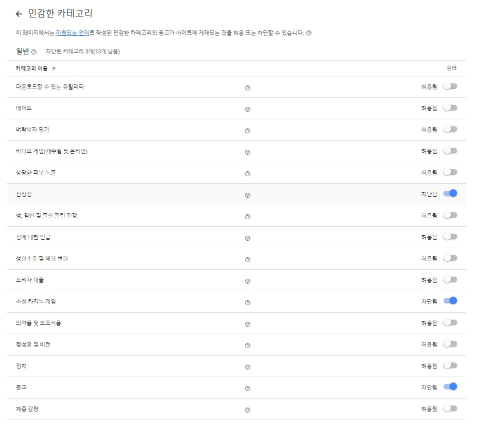 민감한 카테고리 메뉴를 클릭하면 아래 그림처럼 다양한 광고 유형별 차단 메뉴가 나온다. 그러면 본인이 원치 않는 유형의 광고를 차단시켜주면 끝이다. 유형의 자세한 설명은 가운데 물음표를 클릭하면 볼 수 있다. 나는 내 블로그에 선정성, 소셜 카지노 게임, 종교 유형의 광고를 차단시켜 주었다.