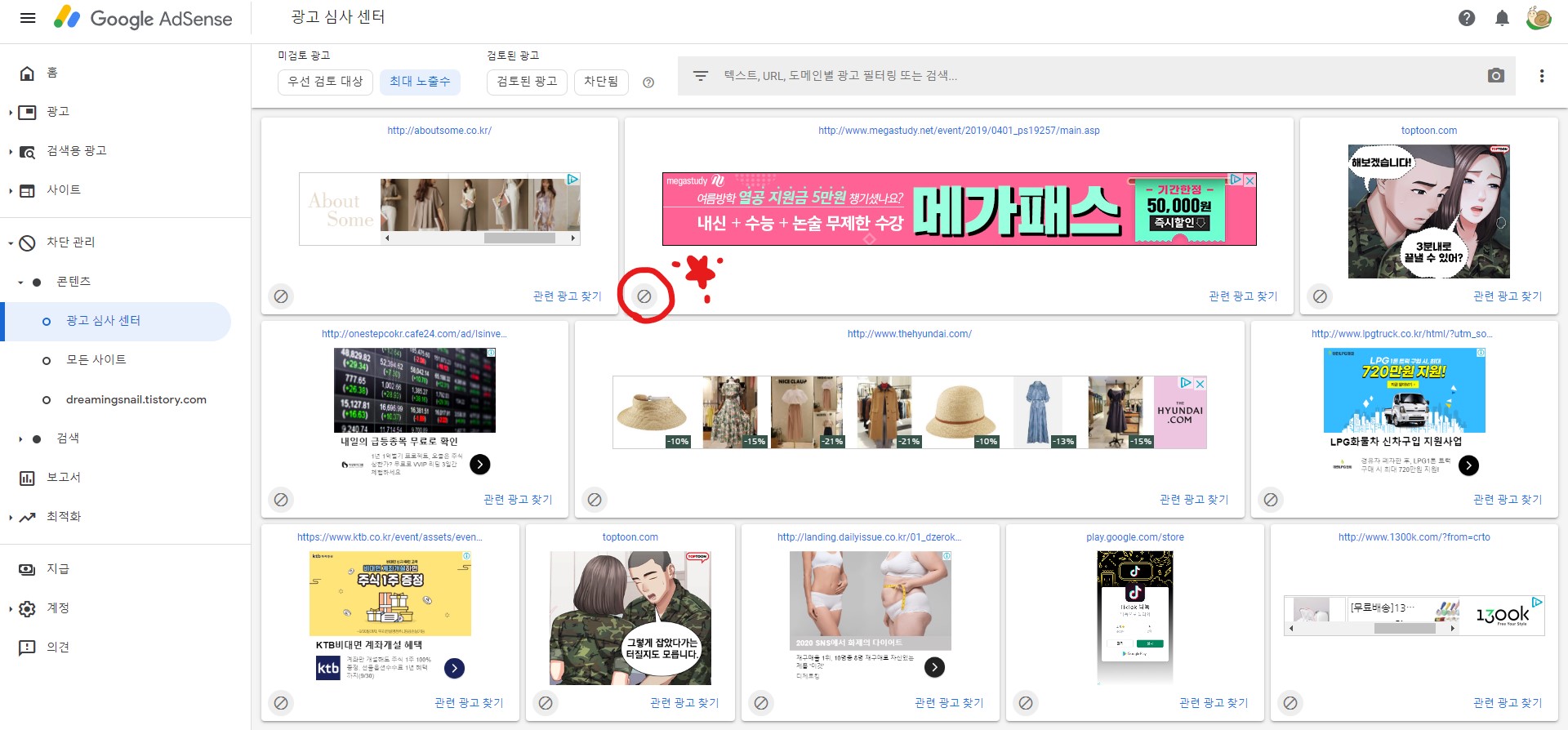 그럼 우선 <차단관리> 메뉴를 클릭해보자. 그러면 다음 그림처럼 콘텐츠 밑에 세가지 하위 메뉴가 나온다. 우선 <광고심사사센터>를 클릭해보자. 그러면 내 블로그에 노출되고 있는 광고들을 모두 보여주는데 개별적으로 내가 원치 않는 광고를 직접 차단할 수 있는 기능이다. 아래 그림의 빨강색 동그라미 버튼을 클릭하면 해당 광고를 내 블로그에서 차단할 수 있게 된다.