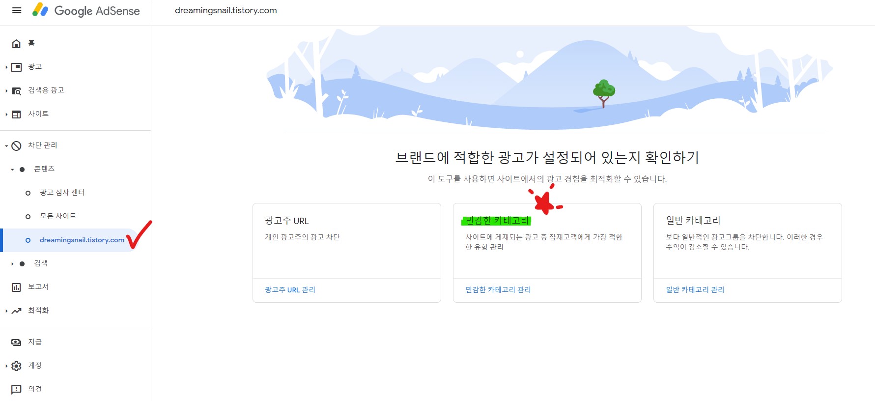 그런데 위 방법을 이용하면 개별적으로 모든 광고들을 일일히 검토해주면서 차단해야 하고 새로운 광고들이 붙게 되면 그때마다 또 확인해줘야 하는 번거로움이 있다. 이럴때 간편하게 광고 유형별로 차단해줄 수 있는 방법이 있다. 아래 그림처럼 내 블로그 주소를 클릭해보자. 그러면 화면 우측에 3가지 메뉴가 뜨는데 가운데 민감한 카테고리를 이용하면 광고 유형별로 효과적으로 차단이 가능하다. 그러면 민감한 카테고리를 클릭해보자.