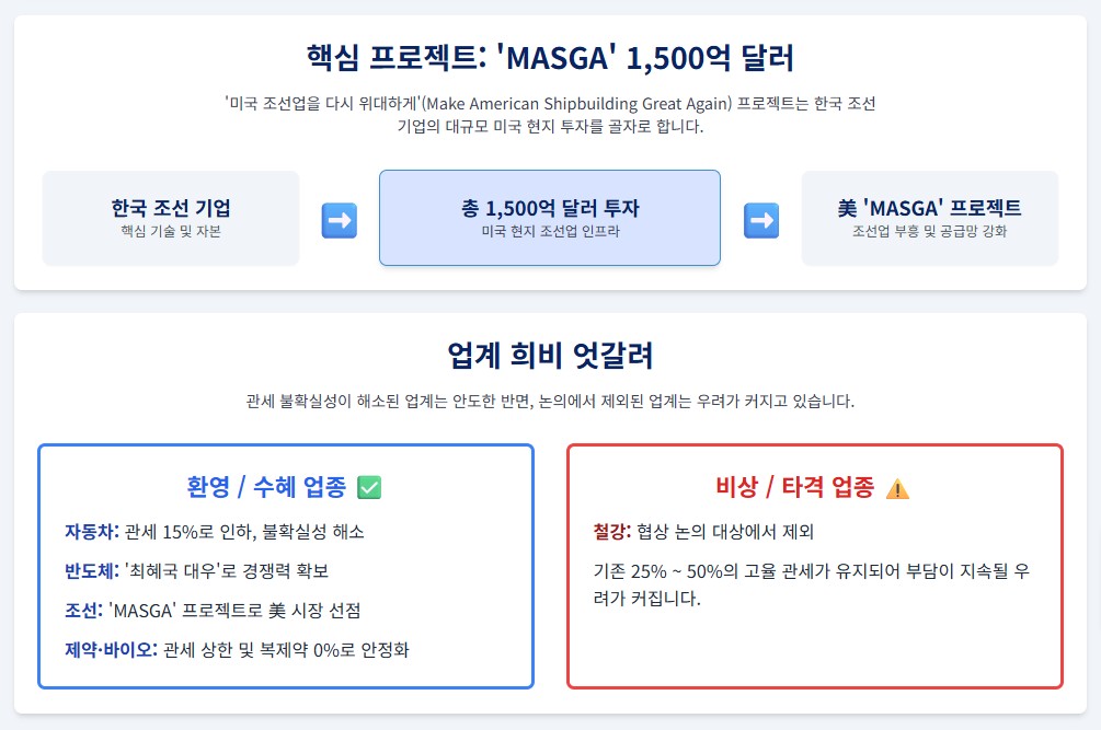 이번 합의에 대해 자동차, 반도체, 조선업계는 관세 불확실성 해소에 안도하며 일제히 환영의 뜻을 밝혔으나, 철강업계는 25%에서 50%의 고율 관세가 지속됨에도 협상 논의 대상에서 제외되면서 비상등이 켜지는 등 업계의 희비가 엇갈렸다. 정부는 합의 내용의 이행을 위해 지난 16일 이재용 삼성전자 회장, 최태원 SK그룹 회장 등 주요 기업인들과 민관 합동회의를 열고 후속 절차에 대한 의견을 청취하며 합의 이행에 속도를 내고 있다.