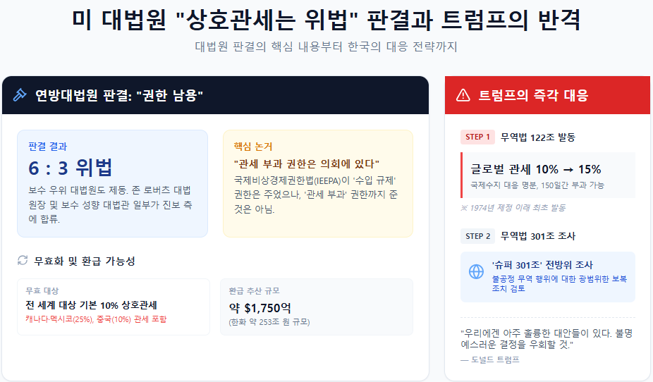 💡 미 대법원이 트럼프 대통령의 상호관세 부과가 대통령 권한을 넘어선 위법이라고 판결.